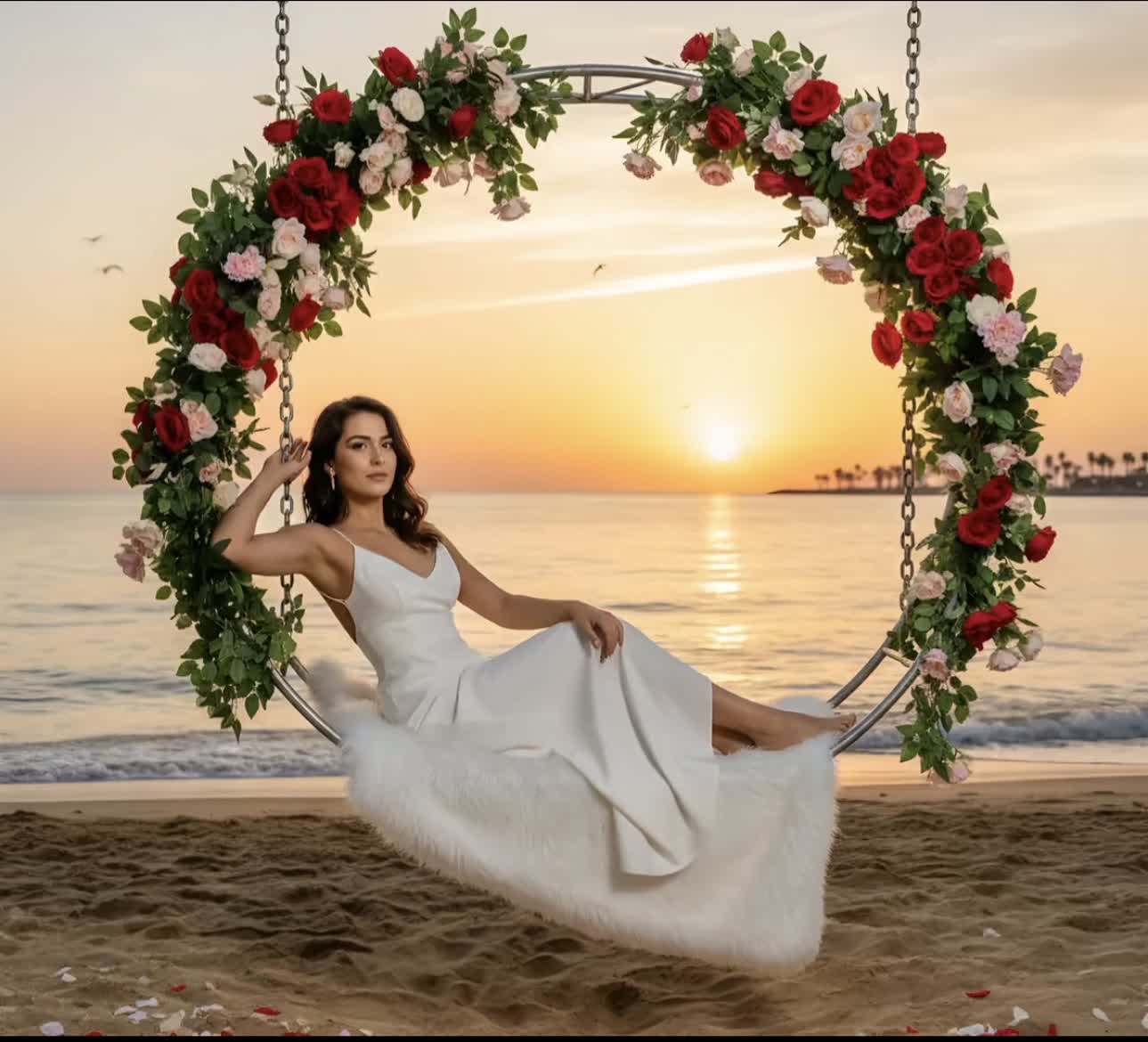 “A wide, highly realistic shot. A young woman in her twenties sits in the center of a circular metal swing suspended by a chain. The girl sits with her back against the chair and her hand resting on the backrest, giving a comfortable, elegant, and sophisticated impression. The swing is lavishly decorated with red flowers, small pink flowers, and soft white flowers intertwined with lush green leaves. The seat is covered with thick, soft white fur that drapes over the edges. Colorful petals and flowers are scattered on the sand surrounding the swing. In the background, a realistic sunset over the sea is seen, with calm waves reflecting on the water's surface. Palm trees appear faintly on the horizon, creating a romantic atmosphere on a dreamy tropical beach. The young woman's skin appears highly realistic, with pronounced pores and fine, natural features to enhance the sense of authenticity. The atmosphere is poetic, calm, and romantic, blending natural elements (the sky, the sea, the sun, the birds, the palm trees) with elegant details (the metal swing, the flower arch, the white fur). Shot with a Leica SL2 camera + APO-Summicron-SL 90mm f/2 lens, ISO 100, t/2, 1/250 sec. 16:9 aspect ratio vertical.”