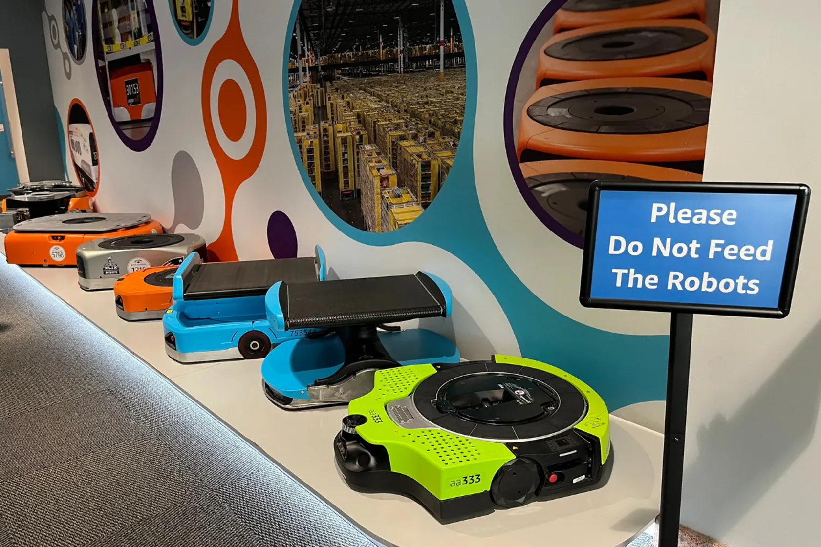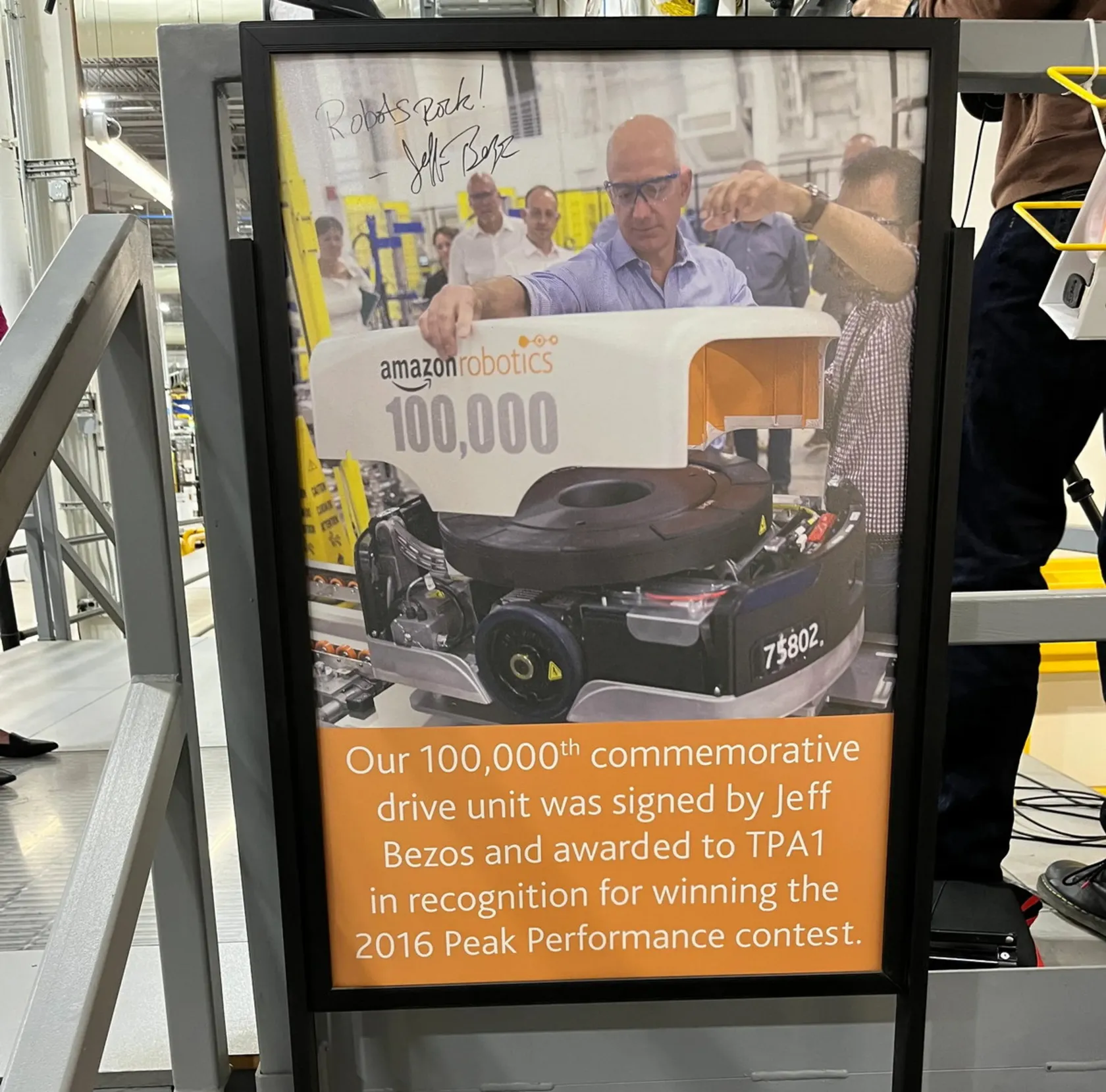 در گوشه ای از سالن، پوستری با امضای جف بیزوس هنوز روی دیوار است؛ یادگار روزهایی که شخصاً در توسعه ی سیستم های رباتیک مشارکت داشت.