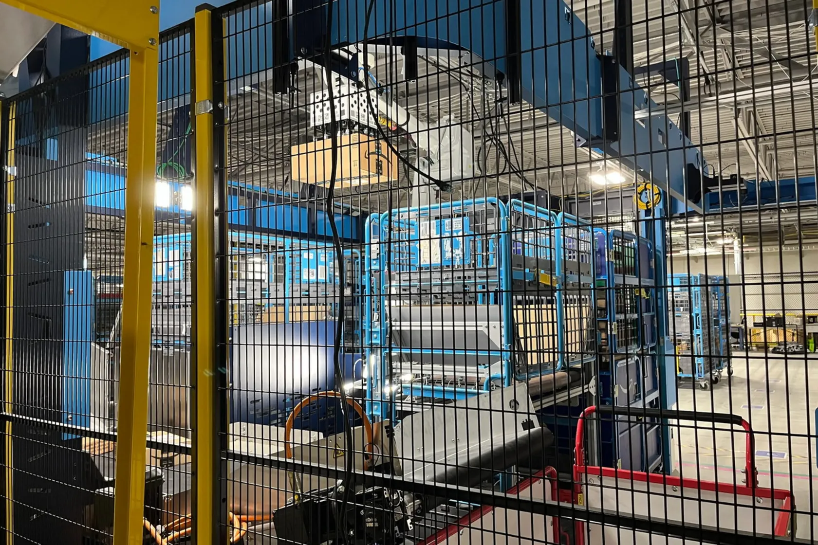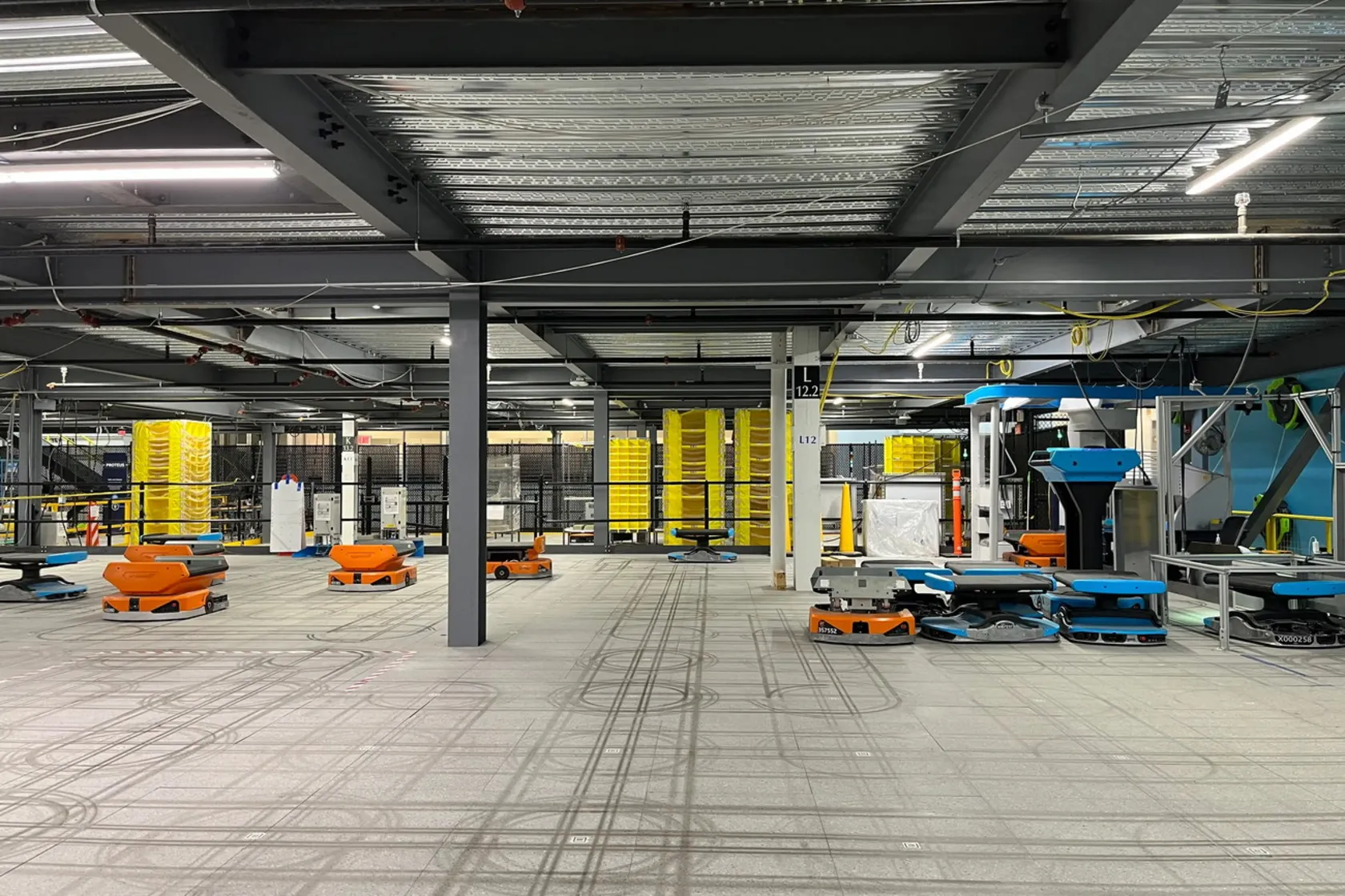 در ادامه، ربات های آبی رنگ Hercules دیده می شوند — ربات هایی قدرتمند که تا 567 کیلوگرم بار را در مراکز تکمیل سفارش جابه جا می کنند.