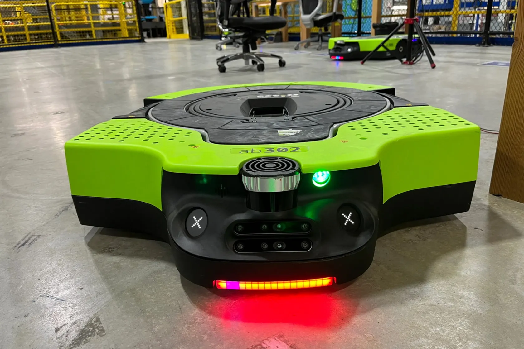 در خط مقدم این صف، ربات سبزرنگ Proteus ایستاده؛ یکی از پیشرفته ترین ربات های آمازون که می تواند حضور انسان را تشخیص دهد و مسیر خود را با دقت تنظیم کند.