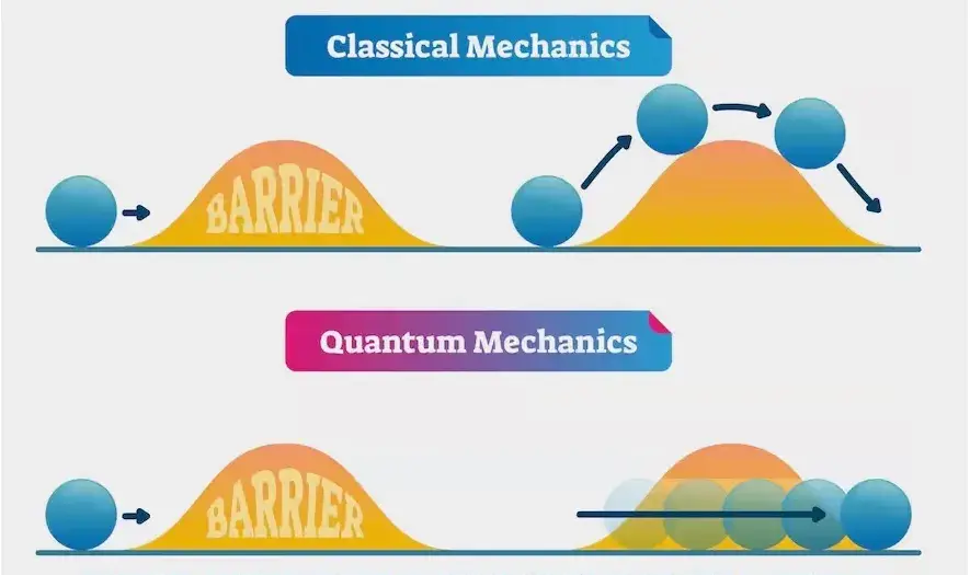 در دنیای کلاسیک، ذرات نمی توانند از مانعی که انرژی کافی ندارند عبور کنند، اما در دنیای کوانتومی، الکترون ها می توانند از میان مانع عبور کنند حتی اگر انرژی شان کمتر از ارتفاع مانع باشد. این پدیده، «تونل زنی کوانتومی» نام دارد و به دلیل رفتار موجی ذرات و مفهوم «تابع موج» رخ می دهد.