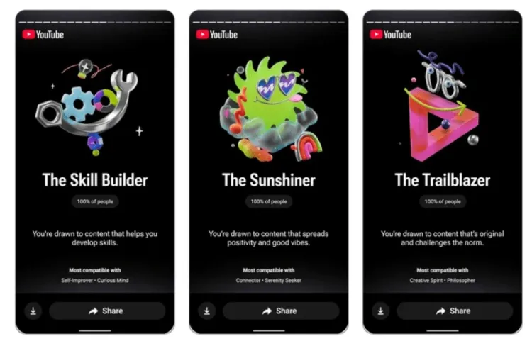یکی از جذاب ترین بخش های Recap، پروفایل شخصیتی است. یوتیوب چند تیپ شخصیتی تعریف کرده که بر اساس نوع ویدیوها و زمان بندی تماشا تولید می شود. برای مثال: